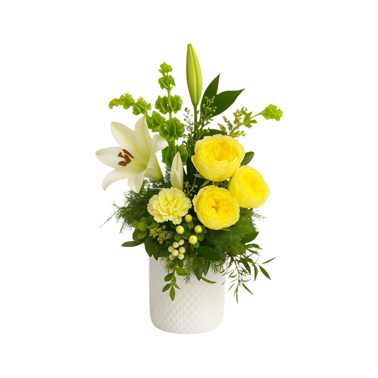 Lemon Glow is a radiant arrangement that captures the warmth of sunshine and the freshness of a blooming garden. Featuring vibrant yellow garden roses, elegant white lilies, and lush greenery, this design adds brightness and joy to any space. Textured greenery and delicate berry accents bring depth and natural charm, all presented in a crisp white ceramic vase for a modern, clean look. Ideal for spring celebrations, cheerful gifts, or brightening any room.